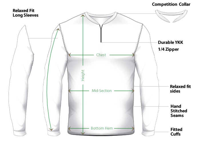 Our Competition Collar is a short styled stand up collar that provides a professional look with a comfortable fit around the neck. This option is shorter than our standard Pro Style and can be zipped up fully to the bottom of the collar. Manufactured with a high-quality performance (100% polyester) wicking fabric that has an Ultraviolet Protection Factor (UPF) of 30. Men’s jerseys are a loose athletic fit. Women’s fit is a tapered cut through the chest and waist that is a close to body fit. Tall sizes add 2” to jersey length. For specific jersey style measurements refer to size chart.